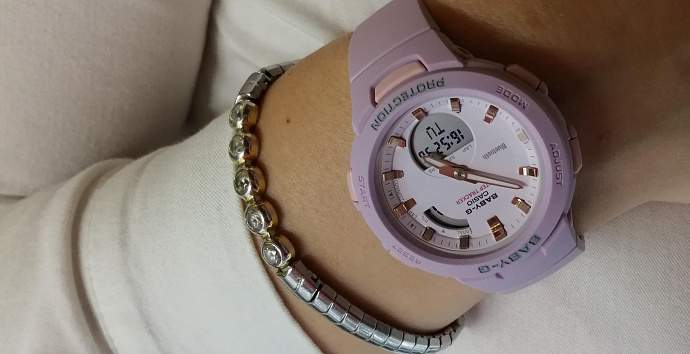 Часы светло-сиреневого цвета.Есть шагомер,будильник,таймер,секундомер и блютуз.Все настройки и просмотр шагов можно делать через телефон.Очень удобно и современно.