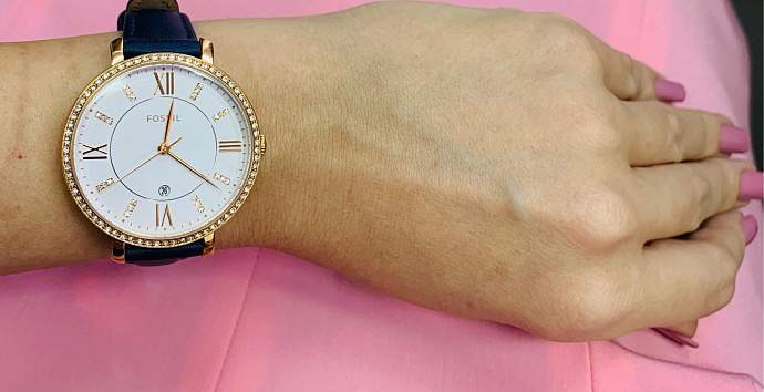 Кварцевые женские наручные часы Fossil ES4291 из коллекции Jacqueline Three-Hand Date Navy Leather Watch.