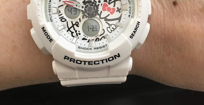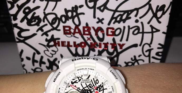 Дизайн часов BABY-G BA-120KT-7A вдохновлен стилем уличных граффити семидесятых с его узнаваемыми тегами, благодаря которому он стал популярен по всему миру, и именно на это же время пришелся выход HELLO KITTY на большую сцену. Часы выполнены в черно-белом цвете: белый ремешок и циферблат часов расписаны тегами HELLO KITTY. Ярким акцентом на циферблате стал узнаваемый красный бант. Само же изображение HELLO KITTY спрятано на обороте часов в виде гравировки с оригинальным рисунком, разработанным специально для коллаборации. Лимитированный релиз продается в упаковке, также повторяющий дизайн часов. Светодиодная подсветка. Для освещения циферблата используется светодиод.Необрит Специальное покрытие обеспечивает длительное послесвечение в темноте даже после кратковременного нахождения на свету.Секундомер (1/100 сек. макс. 1 час) Точное измерение истекшего времени касанием кнопки. Дробь соответствует величине, с точностью до которой производится измерение, а число часов - максимально измеряемому времени.Таймер обратного отсчета (1 мин. макс. 24 час.) Секундомер, работающий в обратном направлении: при окончании отсчета (0 минут, 0 секунд) издается 10 секундный сигнал. Цифры указывают интервал и максимальное время для установок обратного отсчета.Полностью автоматический календарь Автоматически учитываются месяцы разной продолжительности и високосные годы.Будильник