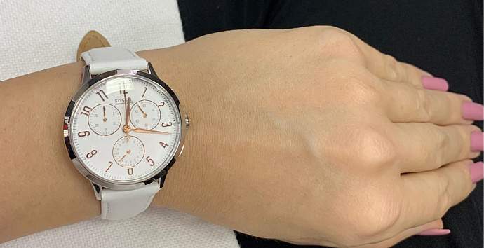 Модель Fossil Abilene Chronograph White Leather Watch женские наручные часы, выполненные в универсальном стиле. Круглый корпус из нержавеющей стали на кожаном ремешке. Циферблат с аппликацией. Сплит-таймер Секундомер. Отображение даты Отображение текущей даты в аналоговых часах.