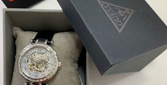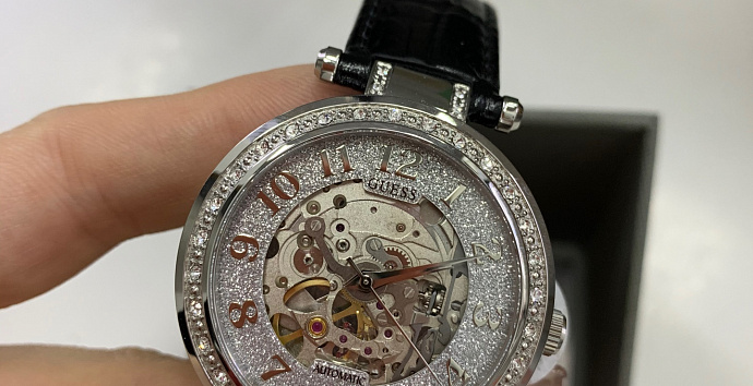 Скелетонизированные механические часы. Корпус украшен кристаллами. Кожаный ремешок с классической застежкой.